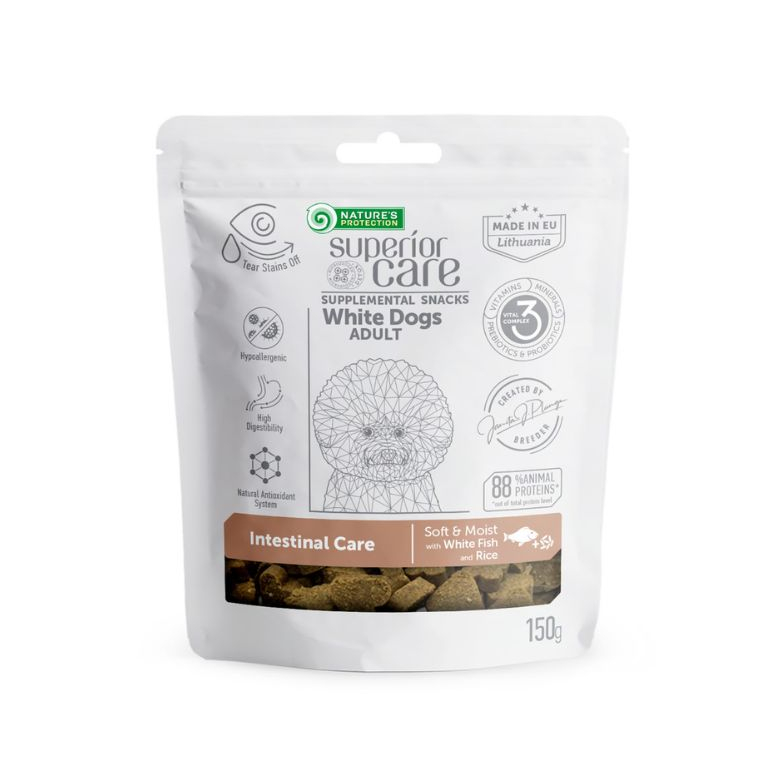 Беззернові ласощі Nature's Protection Superior Care White Dogs Intestinal Care – це високоякісна добавка до корму, призначена для дорослих собак усіх порід. Це чудовий вибір, щоб показати любов до вашого улюбленця й водночас забезпечити його щоденною нормою необхідних вітамінів, мінералів, пребіотиків та пробіотиків.