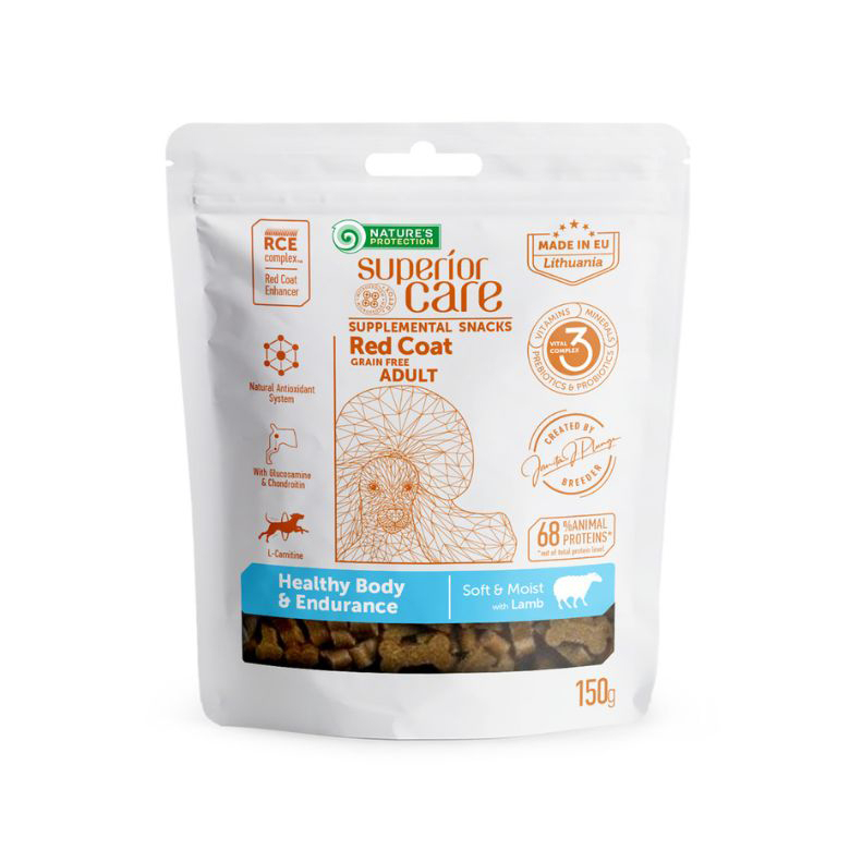 Беззернові ласощі Nature's Protection Superior Care Red Coat Healthy Body & Endurance – це високоякісна добавка до корму, призначена юніорів усіх порід. Це чудовий вибір, щоб показати любов до вашого улюбленця й водночас забезпечити його щоденною нормою необхідних вітамінів, мінералів, пребіотиків та пробіотиків.