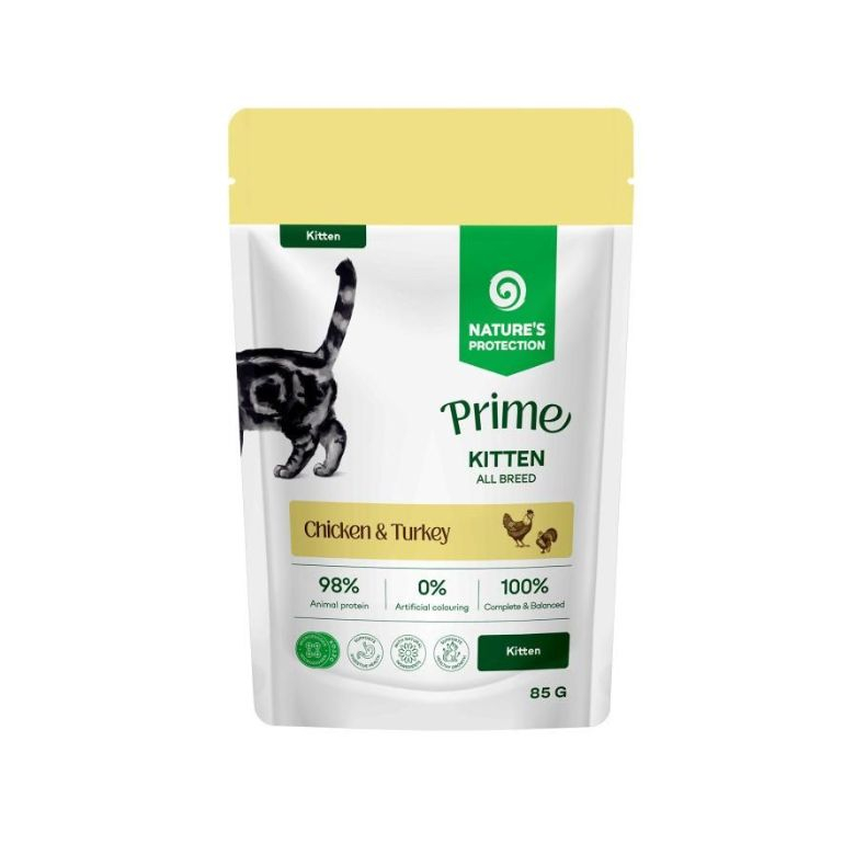 Повноцінний вологий корм Nature's Protection Prime з курятиною та індичкою створений для кошенят усіх порід. Це джерело щоденної енергії для зростаючого організму, коли кожен етап розвитку важливий. Збалансований і повноцінний склад, ніжна текстура та легкозасвоювані поживні речовини сприяють здоровому росту та розвитку, роблячи кошеня сильним, активним і допитливим. Ніжні шматочки в соусі – відмінно смакують маленьким улюбленцям.