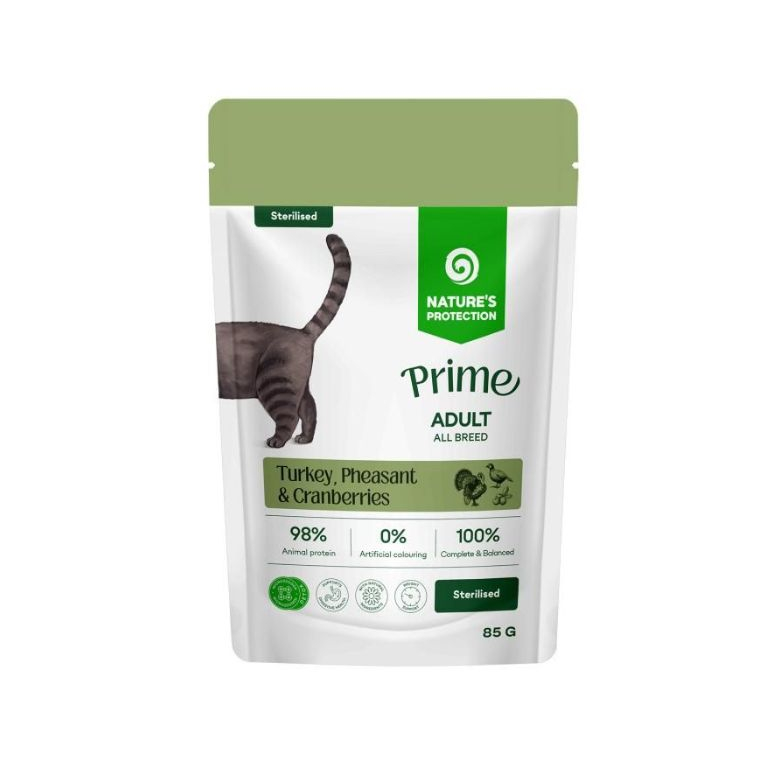 Повноцінний вологий корм Nature's Protection Prime з індичкою, м’ясом фазана та журавлиною створений для дорослих стерилізованих котів усіх порід. Це щоденний раціон, який поєднує улюблений смак і користь у кожному шматочку. Збалансований склад, ніжна текстура та легкозасвоювані поживні речовини допомагають підтримувати оптимальну вагу, енергію, гарне самопочуття та здоров’я організму улюбленця. М’які шматочки в соусі відмінно смакують навіть найвибагливішим котам.