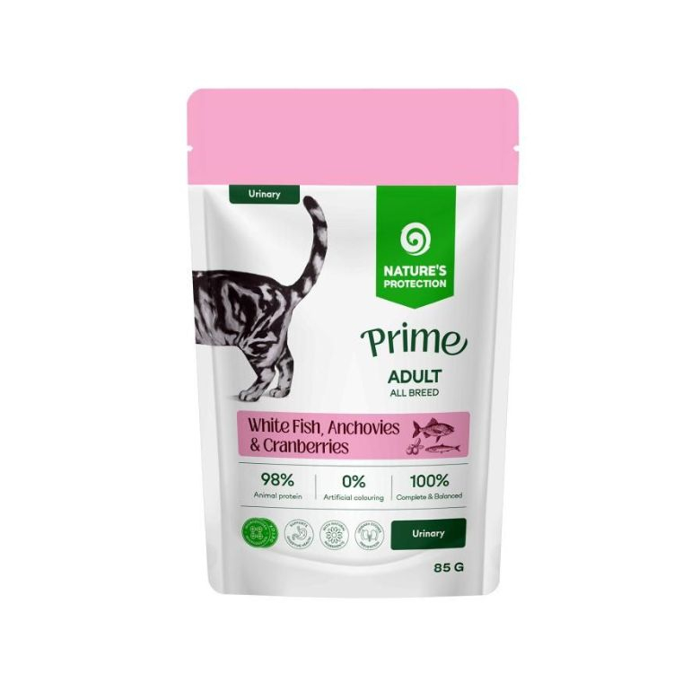 Повноцінний вологий корм Nature's Protection Prime Diet з білою рибою, анчоусами та журавлиною створений для дорослих котів із чутливою сечовидільною системою. Це щоденний раціон, який поєднує улюблений смак і користь у кожному шматочку. Легкозасвоювані білки, ніжна текстура та збалансований склад допомагають підтримувати енергію, оптимальний стан організму та комфорт щодня. М’які шматочки в соусі відмінно смакують навіть найвибагливішим котам.