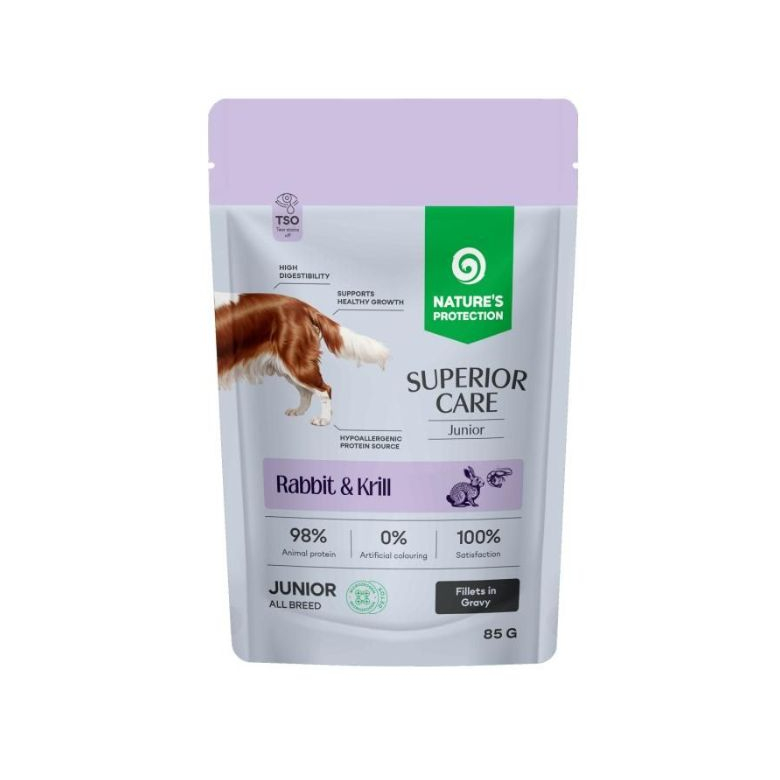 Повноцінний беззерновий вологий корм Nature's Protection Superior Care з кролятиною та крилем створений для юніорів усіх порід. Це турбота про щоденний раціон із урахуванням потреб зростаючого організму: формула з високим вмістом якісного тваринного білка, доповнена Microzeogen і спеціальними активними компонентами, що забезпечують комплексну підтримку імунітету, правильного росту, травлення та загального здоров’я.