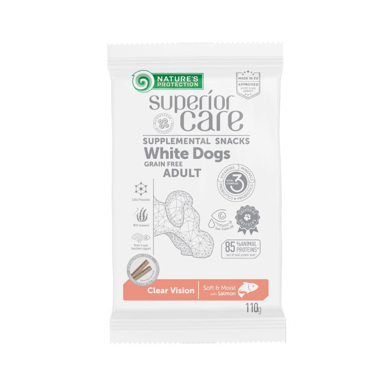 Беззернові ласощі Nature's Protection Superior Care White Dogs Grain Free Clear Vision – це високоякісна добавка до корму, призначена дорослих собак усіх порід. Це чудовий вибір, щоб показати любов до вашого улюбленця й водночас забезпечити його щоденною нормою необхідних вітамінів, мінералів, пребіотиків та пробіотиків.