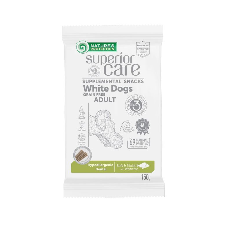 Беззернові ласощі Nature's Protection Superior Care White Dogs Grain Free Hypoallergenic Dental – це високоякісна добавка до корму, призначена для дорослих собак усіх порід. Це чудовий вибір, щоб показати любов до вашого улюбленця й водночас забезпечити його щоденною нормою необхідних вітамінів, мінералів, пребіотиків та пробіотиків.