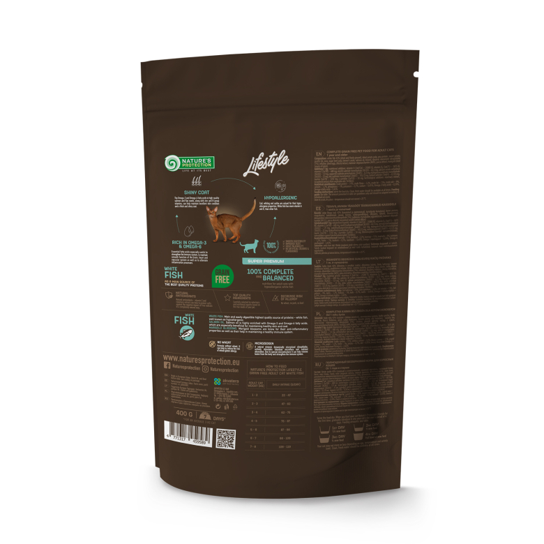 Nature's Protection Lifestyle Grain Free з білою рибою для дорослих котів – це повнораціонний збалансований сухий корм супер преміум класу з високоякісними джерелами білка та сировиною. Цей повнораціонний сухий корм спеціально розроблений для дорослих котів, щоб допомогти забезпечити безперебійну роботу травної системи. Він збагачений інноваційними інгредієнтами, які не містять глютену та сприяють підтримці доброго самопочуття улюбленця. Повноцінний склад цього сухого корму не тільки забезпечить вашого вихованця всіма необхідними поживними речовинами, але й гарантує ідеальне засвоєння, твердий стілець та блискучу шерсть.