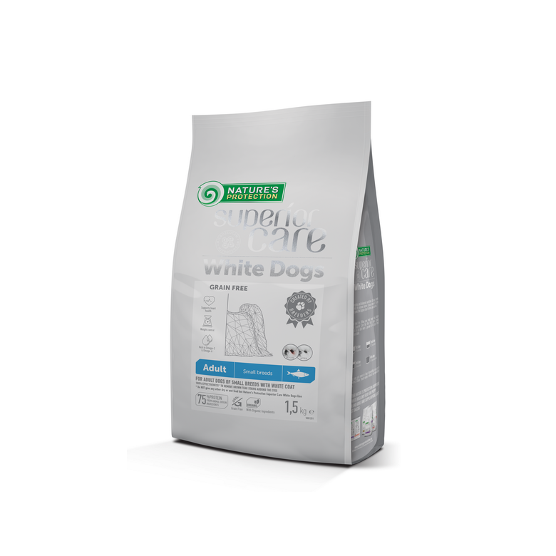 Сухий беззерновий корм Nature's Protection Superior Care з оселедцем для дорослих собак малих порід – це повноцінний і збалансований корм Супер Преміум сегменту з джерелом білка та сировини найвищої якості, що допомагає боротися з коричневими плямами від сліз та підтримувати шкіру й шерсть здоровими. Корм містить формулу Tear Stains off – ретельно підібраний комплекс амінокислот і добре збалансованих інгредієнтів у складі. Збагачений компонентами, що забезпечують відмінну продуктивність для доброго самопочуття вихованця. Повноцінний склад сухого корму не тільки забезпечить вашого улюбленця всіма необхідними поживними речовинами, але й має відмінні смакові якості та засвоюваність.