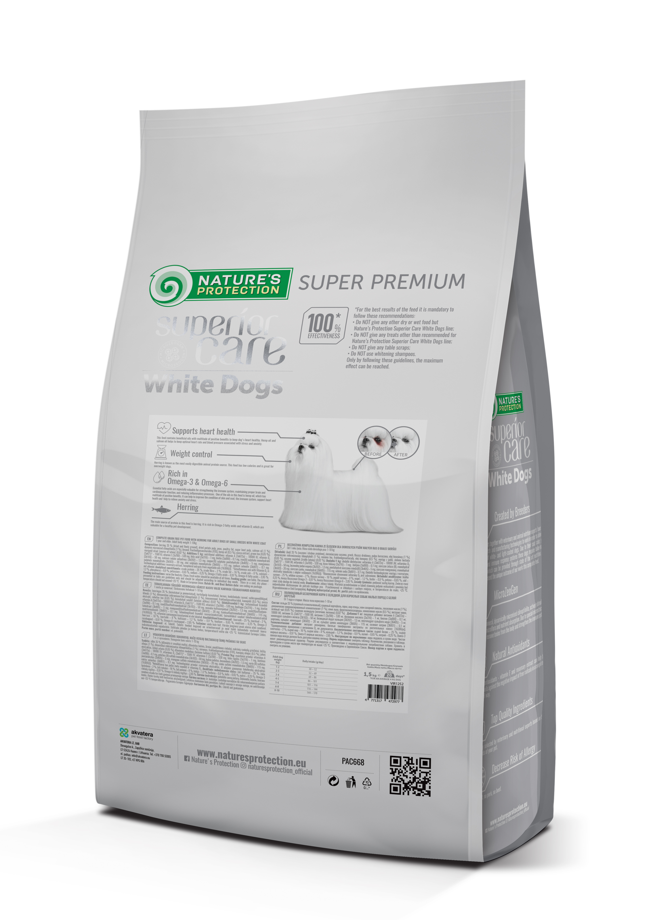 Корми з лінійки Nature’s Protection Superior Care White Dogs підходять усім собакам, незалежно від забарвлення шерсті та не впливають на її колір. Ця серія кормів була розроблена спеціально для усунення коричневих плям від сліз, які найпомітніші саме на білій і світлій шерсті вихованців. Проте включення цього корму до раціону собак із темним забарвленням шерсті не призводить до її висвітлення або зміни кольору.