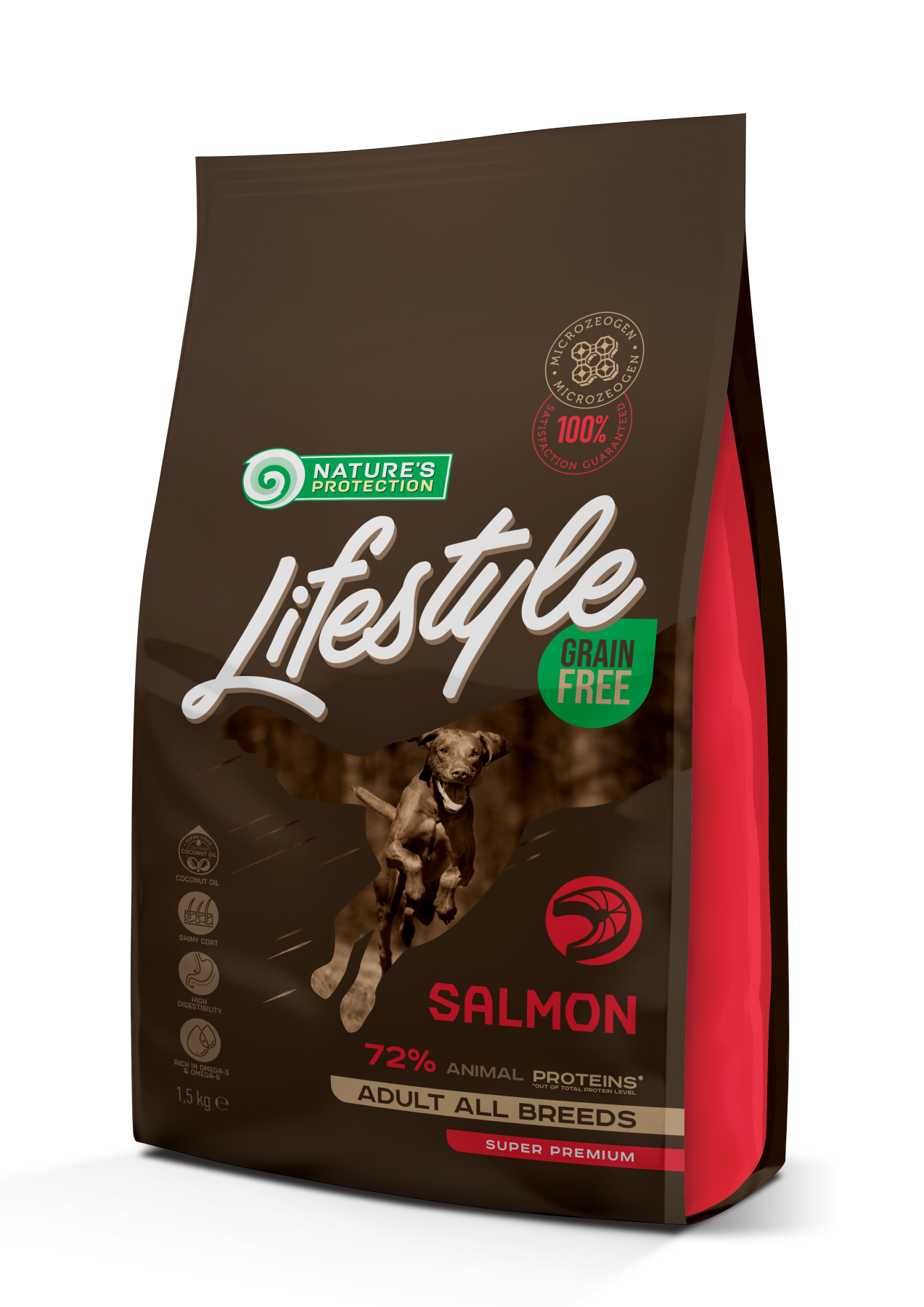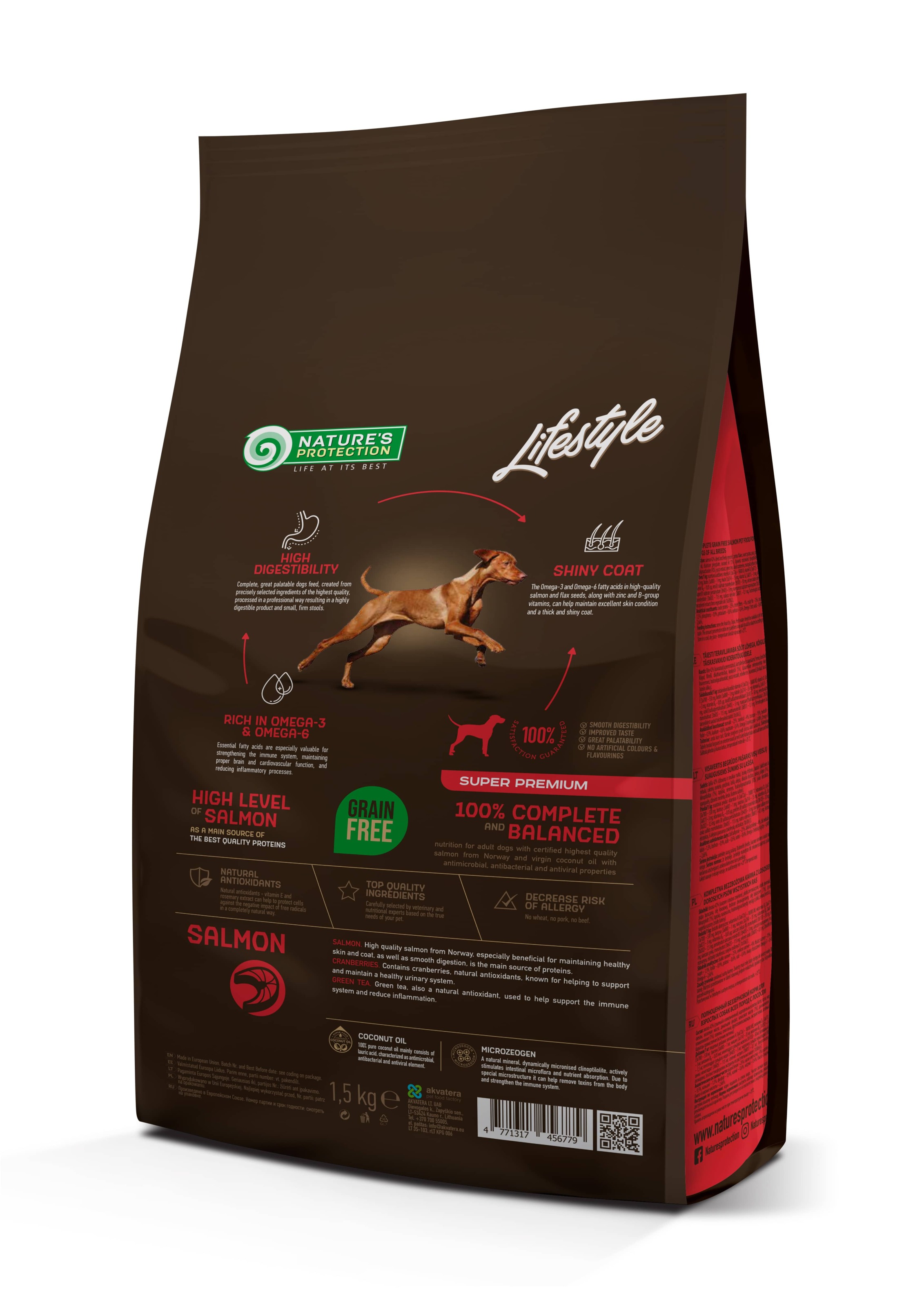 Nature’s Protection Lifestyle Grain Free with Salmon for Adult All Breeds – повнораціонний і збалансований сухий корм супер преміум класу з джерелом білка та сировини найвищої якості. Повнораціонний сухий корм спеціально розроблений для дорослих собак усіх порід, щоб підтримувати здорову вагу, забезпечуючи оптимальний рівень енергії. Збагачений інноваційними інгредієнтами, які не містять глютену та ефективні для благополуччя вихованця. Збалансована формула цього сухого корму для собак не тільки забезпечить вашого улюбленця всіма ефективними поживними речовинами, але також забезпечить ідеальну засвоюваність і здоровий стан шкіри та шерсті.