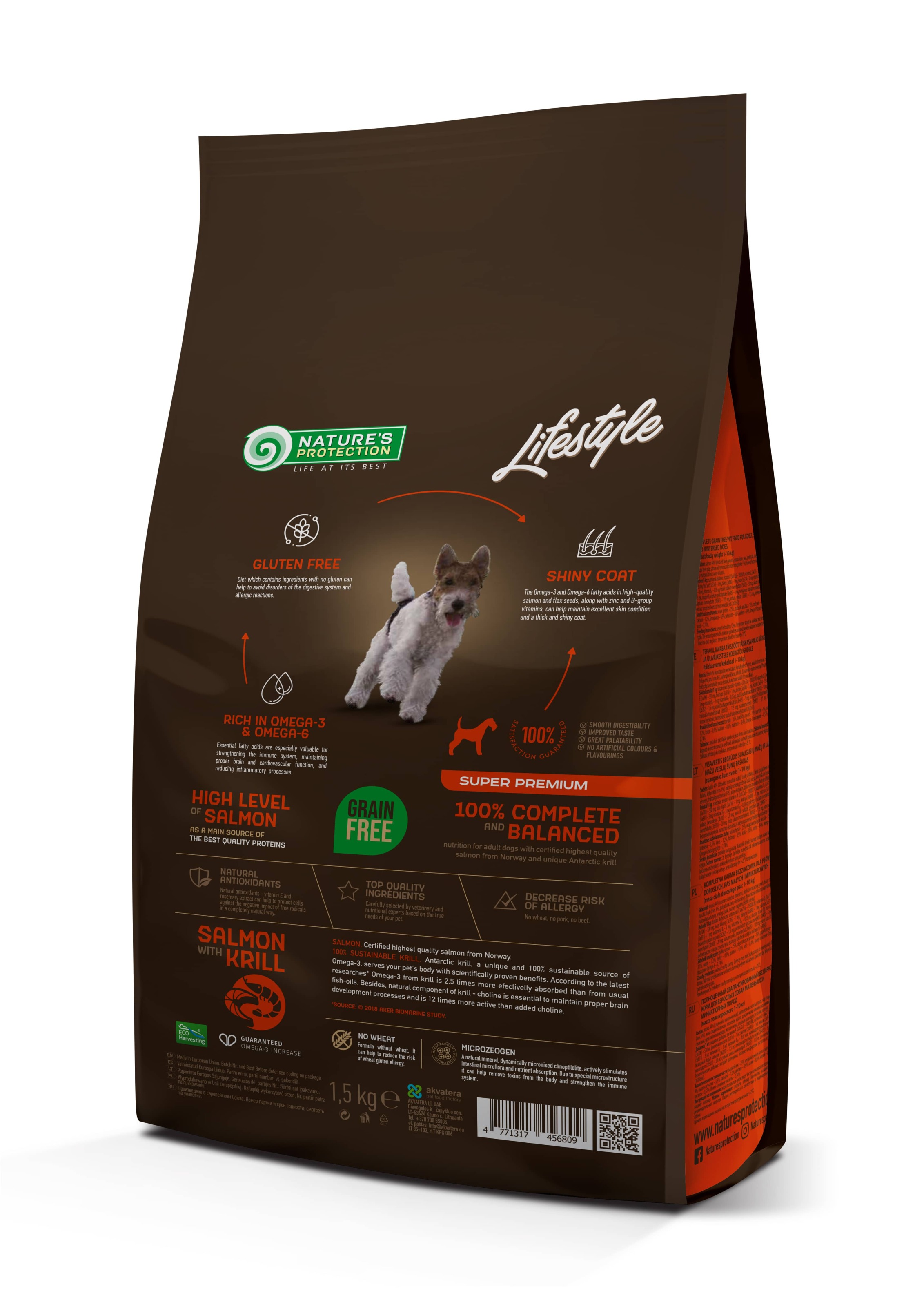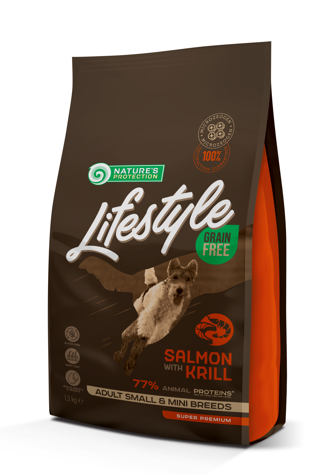 Nature’s Protection Lifestyle Grain Free with Salmon and Krill for Adult Small and Mini Breeds — повнораціонний і збалансований сухий корм для собак супер преміум класу з джерелом білка та сировини найвищої якості. Цей сухий корм спеціально розроблений для дорослих собак дрібних і міні порід, щоб забезпечити безперебійне травлення. Збагачений інноваційними інгредієнтами, які не містять глютену та ефектині для благополуччя вихованця. Формула цього сухого корму не тільки забезпечить вашого вихованця всіма ефективними поживними речовинами, але й сприятиме підтримці здорового стану шкіри та блискучої шерсті.