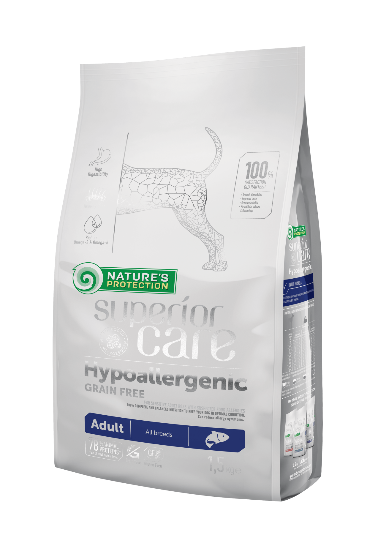 Гіпоалергенний беззерновий корм з лососем для дорослих собак усіх порід Nature's Protection Superior Care – це повнораціонний збалансований сухий корм супер преміум класу з джерелом білка та сировиною найвищої якості. Цей повнораціонний гіпоалергенний сухий корм спеціально розроблений для собак із чутливою травною системою. Він збагачений інгредієнтами, які забезпечують ідеальну продуктивність для гарного самопочуття улюбленця. Повноцінний склад сухого корму не тільки забезпечить вашого улюбленця всіма необхідними поживними речовинами, але й гарантує ідеальну засвоюваність та смакові якості.