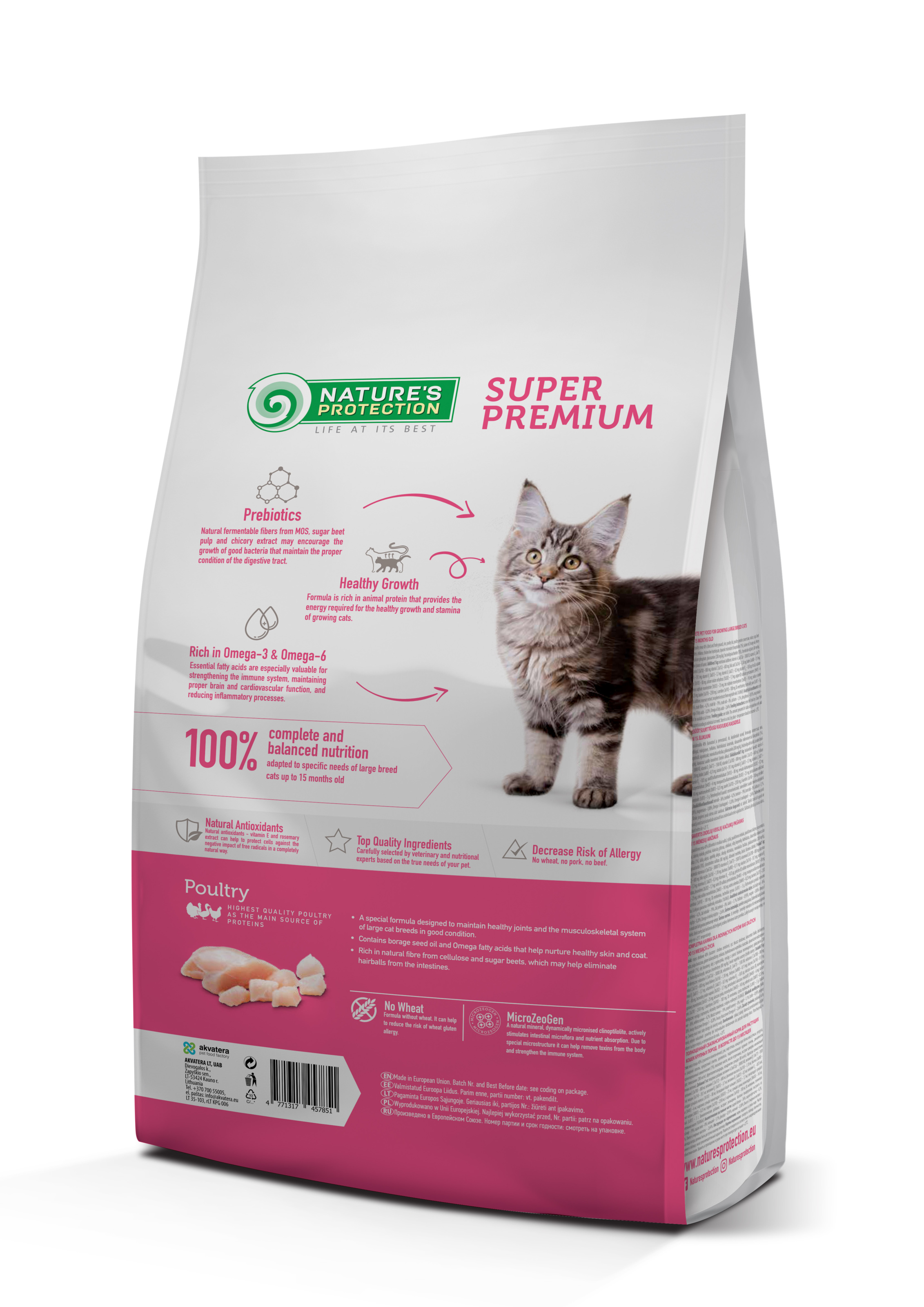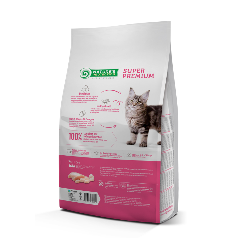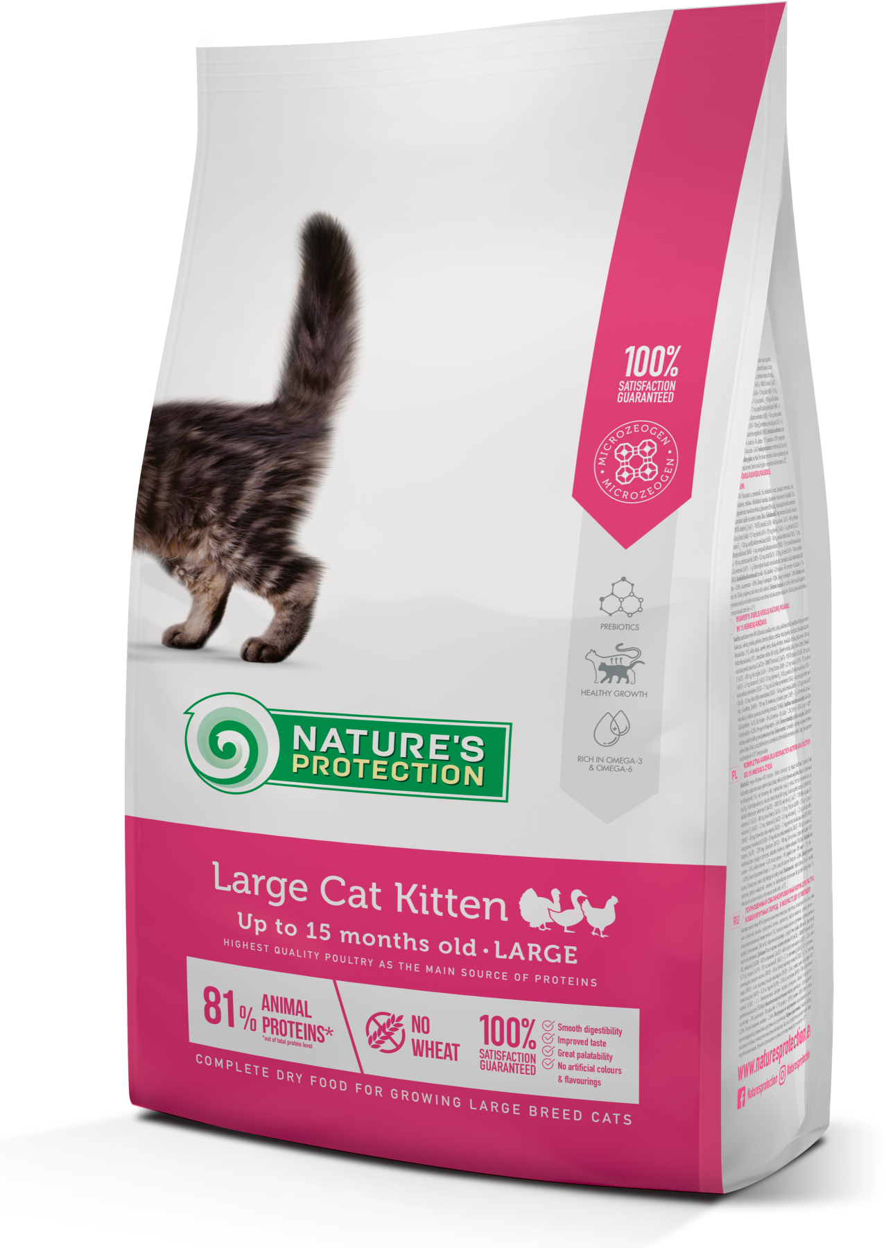 „Nature's Protection Large Cat” – спеціалізований повнораціонний корм для молодих котів (до 15 місяців) великих порід. Унікальна формула корму сприяє правильному розвитку суглобів та м'язів вихованця.