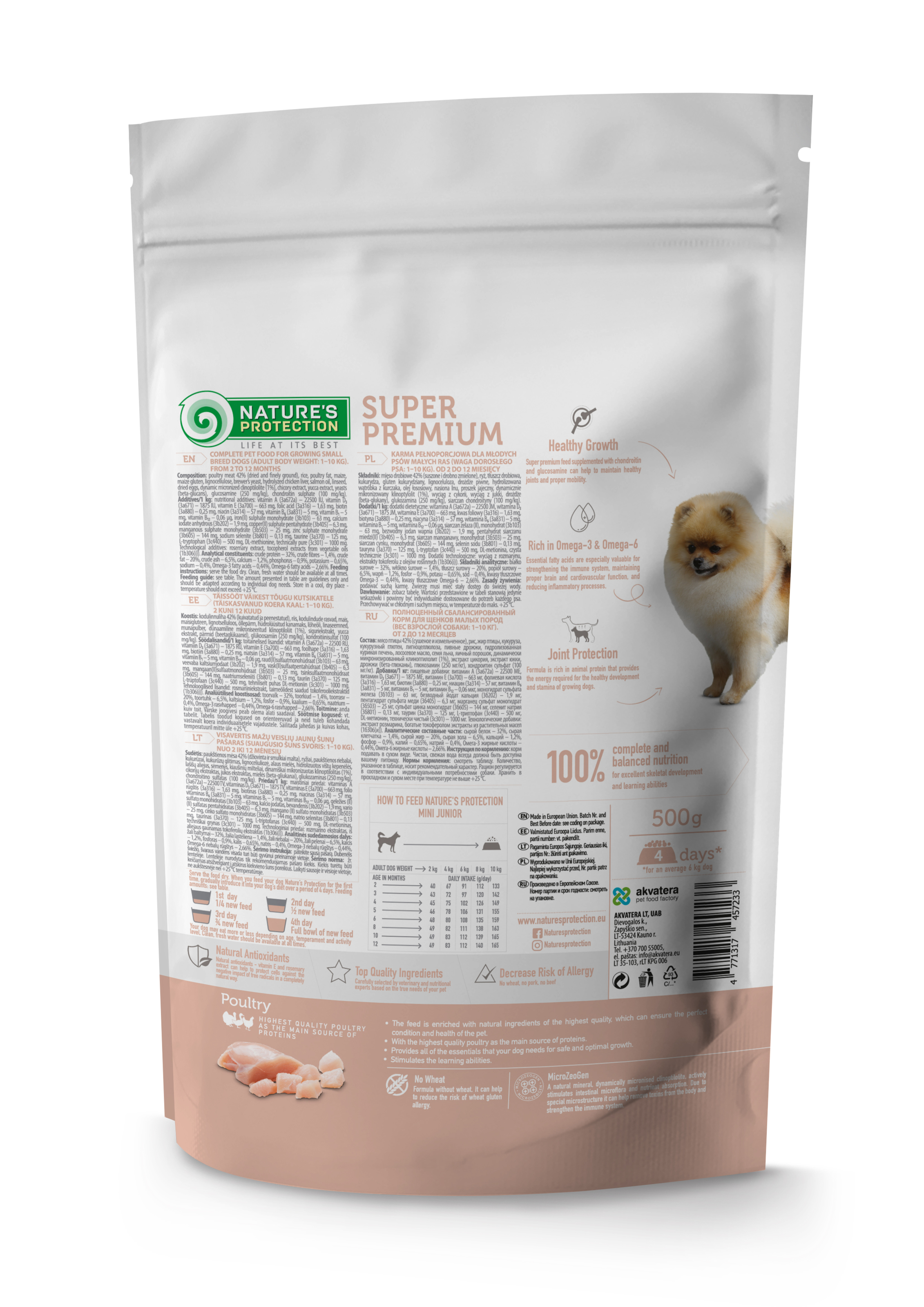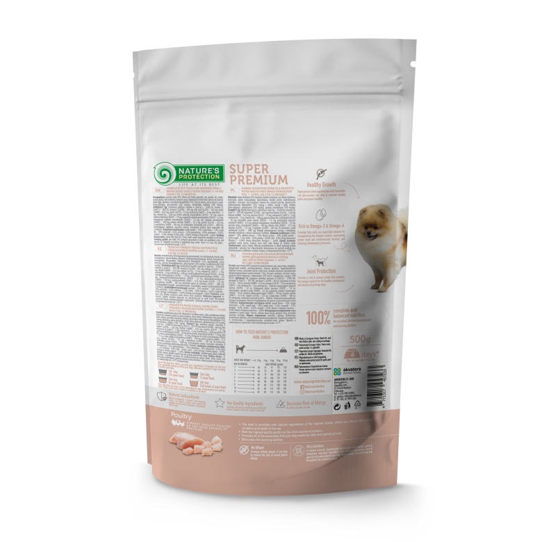 Nature's Protection for Junior Small Breed Dogs with Poultry — це повнораціонний і збалансований сухий корм супер-преміум класу з джерелом білка та сировиною найвищої якості. Склад цього сухого корму для молодих собак збагачений інгредієнтами, які ідеально підходять для забезпечення необхідної кількості калорій, вітамінів і мінералів. Повноцінний сухий корм для собак не тільки забезпечить вашого улюбленця всіма ефективними поживними речовинами, але й підтримуватиме правильний розвиток і рівень енергії.