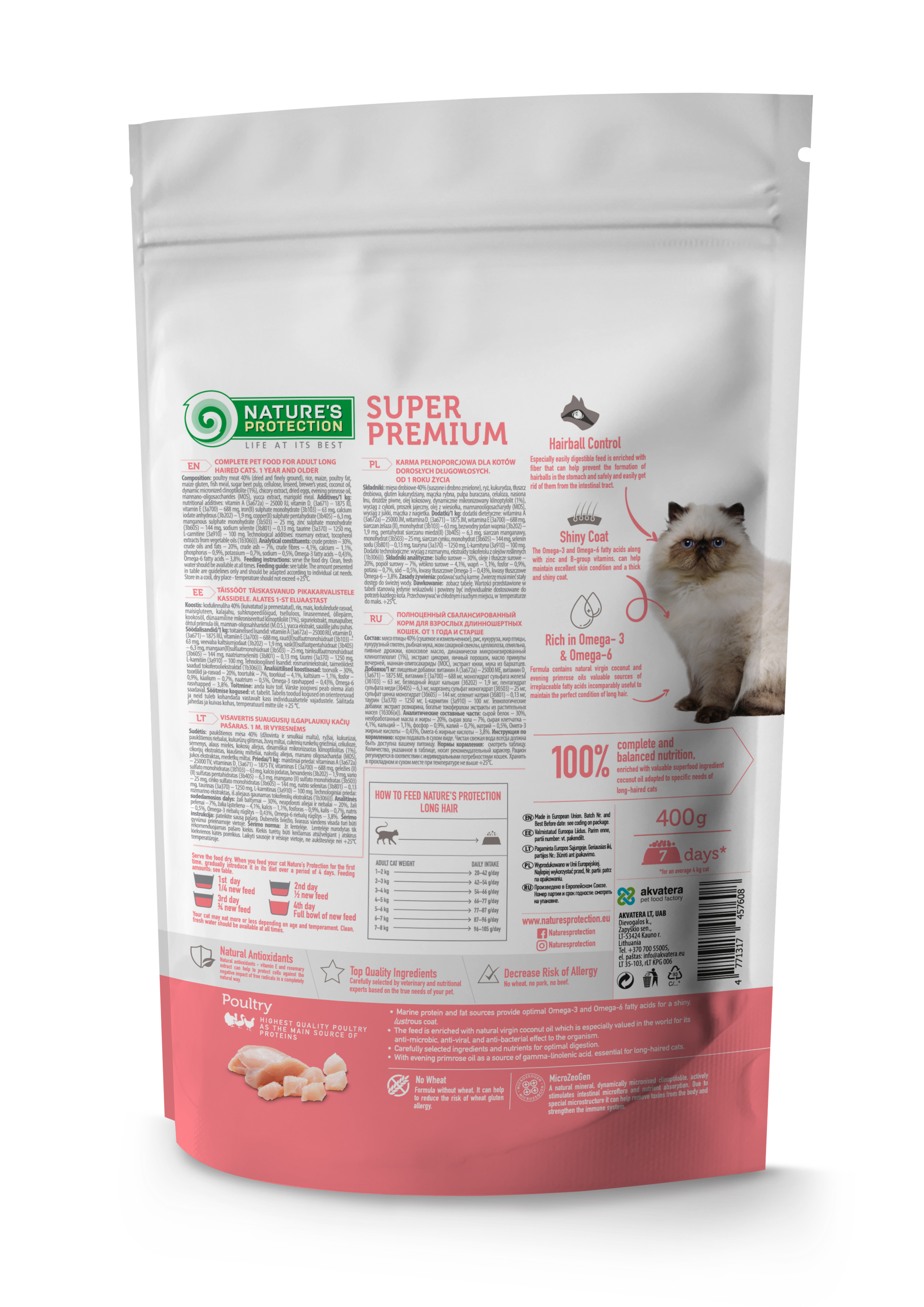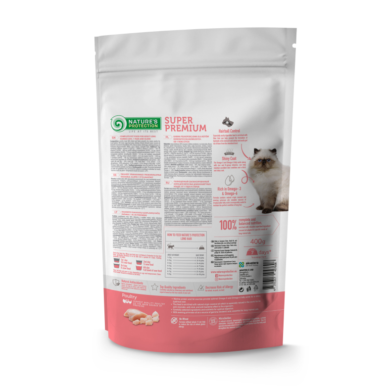 Nature's Protection Long Hair з м'ясом птиці для котів віком від 1 року – це повнораціонний збалансований сухий корм супер преміум класу з високоякісними джерелами білка та сировини. Склад цього сухого корму збагачений інгредієнтами, які ідеально підходять для забезпечення необхідної кількості калорій, вітамінів і мінералів для котів з довгою шерстю.