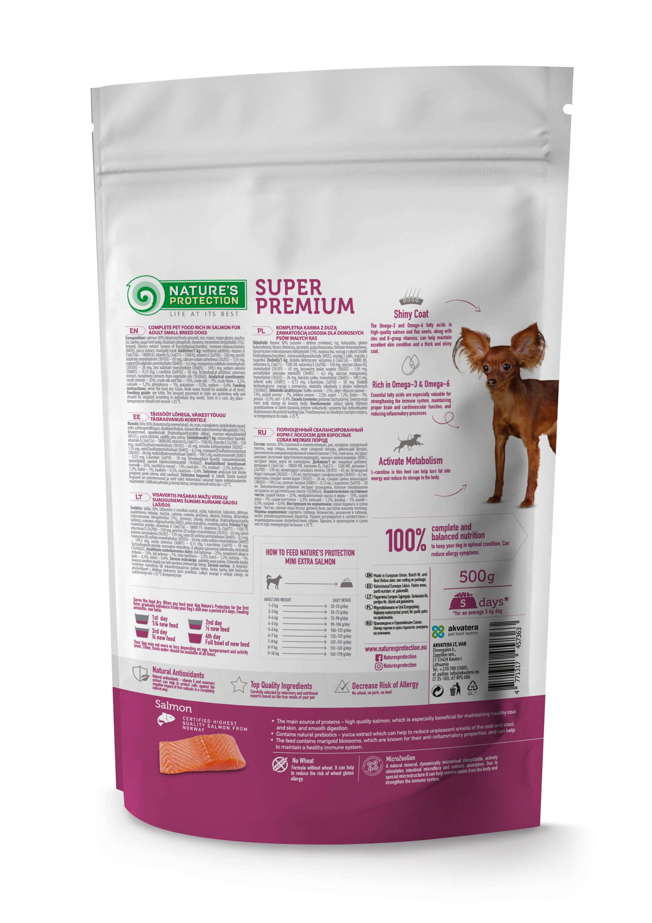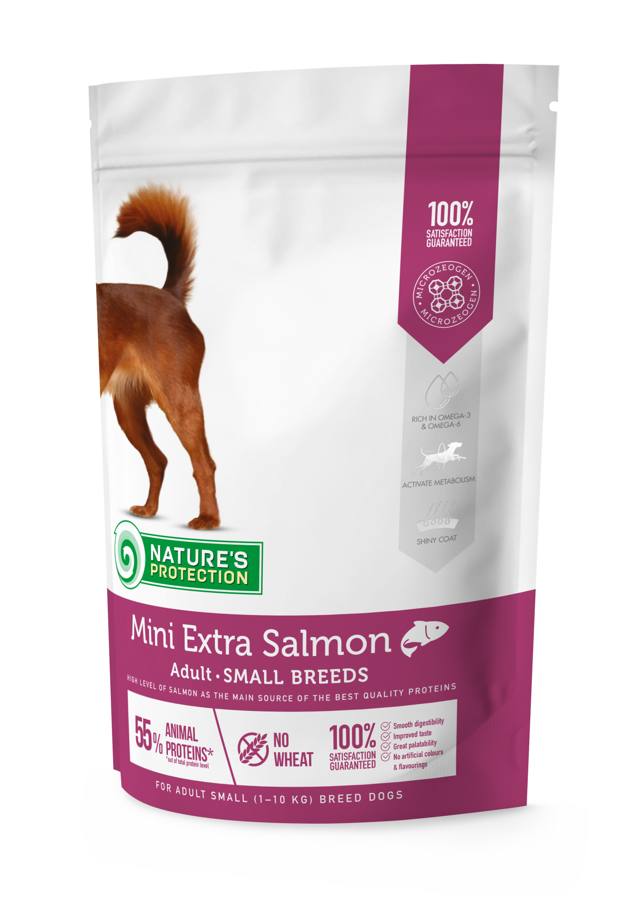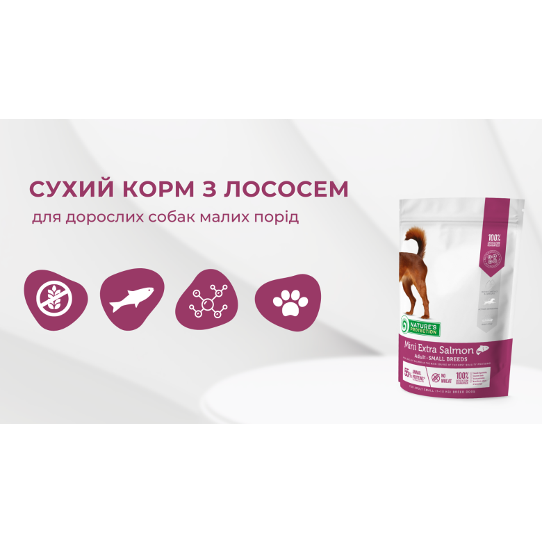 Nature's Protection Mini Extra Salmon for Adult Small Breed Dogs – це повнораціонний збалансований сухий корм супер преміум класу з високоякісними джерелами білка та сировиною. Склад цього сухого корму збагачений інгредієнтами, які ідеально підходять для забезпечення необхідної кількості калорій, вітамінів і мінералів. Повноцінний склад сухого корму не тільки забезпечить вашого улюбленця всіма необхідними поживними речовинами, але й гарантує ідеальну засвоюваність, смакові якості та блискучу шерсть.