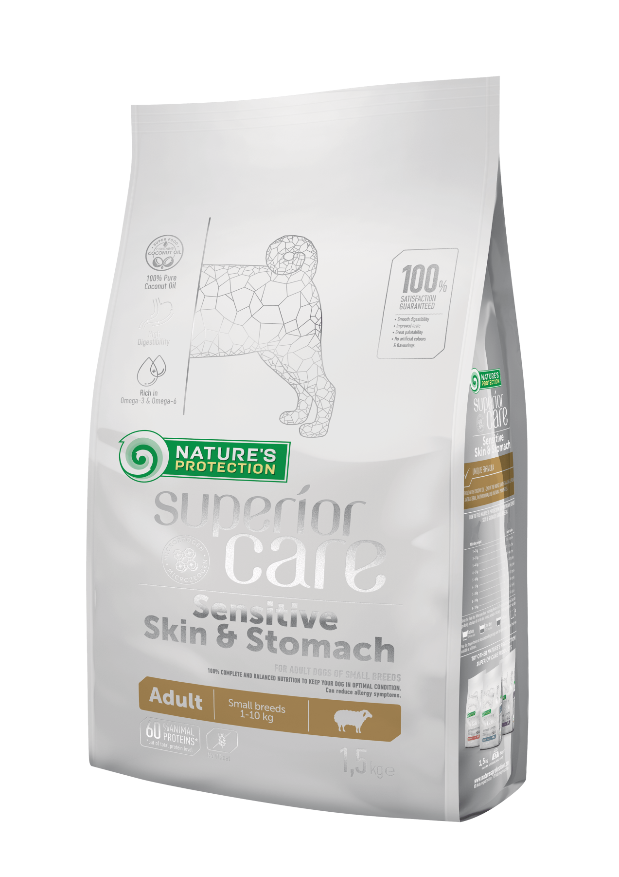 Nature's Protection Superior Care Sensitive Skin&Stomach Grain Free with Lamb для дорослих собак усіх порід – це повнораціонний збалансований сухий корм супер преміум класу з високоякісними джерелами білка та сировиною. Цей повнораціонний сухий корм спеціально розроблений для собак малих порід з особливо чутливою шкірою та травною системою. Він збагачений інгредієнтами, які не подразнюють травну систему і забезпечують ідеальну роботу для гарного самопочуття улюбленця. Повноцінний склад сухого корму не тільки забезпечить вашого улюбленця всіма необхідними поживними речовинами, але й гарантує ідеальну засвоюваність та смакові якості.