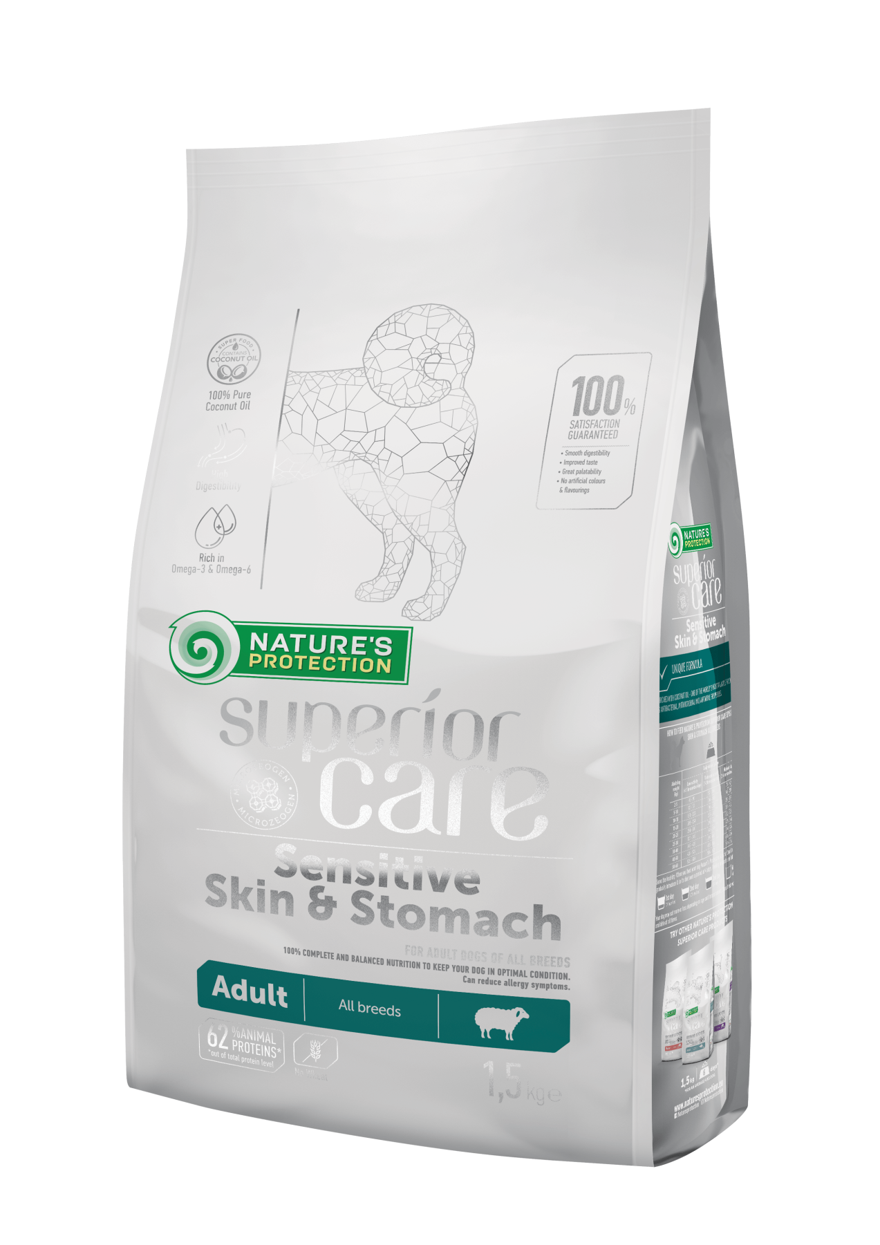 Nature's Protection Superior Care Sensitive Skin&Stomach Grain Free with Lamb для дорослих собак усіх порід – це повнораціонний збалансований сухий корм супер преміум класу з високоякісними джерелами білка та сировиною. Цей повнораціонний сухий корм спеціально розроблений для собак усіх порід з особливо чутливою шкірою та травною системою. Він збагачений інгредієнтами, які не подразнюють травну систему та забезпечують ідеальну продуктивність для гарного самопочуття улюбленця. Повноцінний склад сухого корму не тільки забезпечить вашого улюбленця всіма необхідними поживними речовинами, але й гарантує ідеальну засвоюваність та смакові якості.