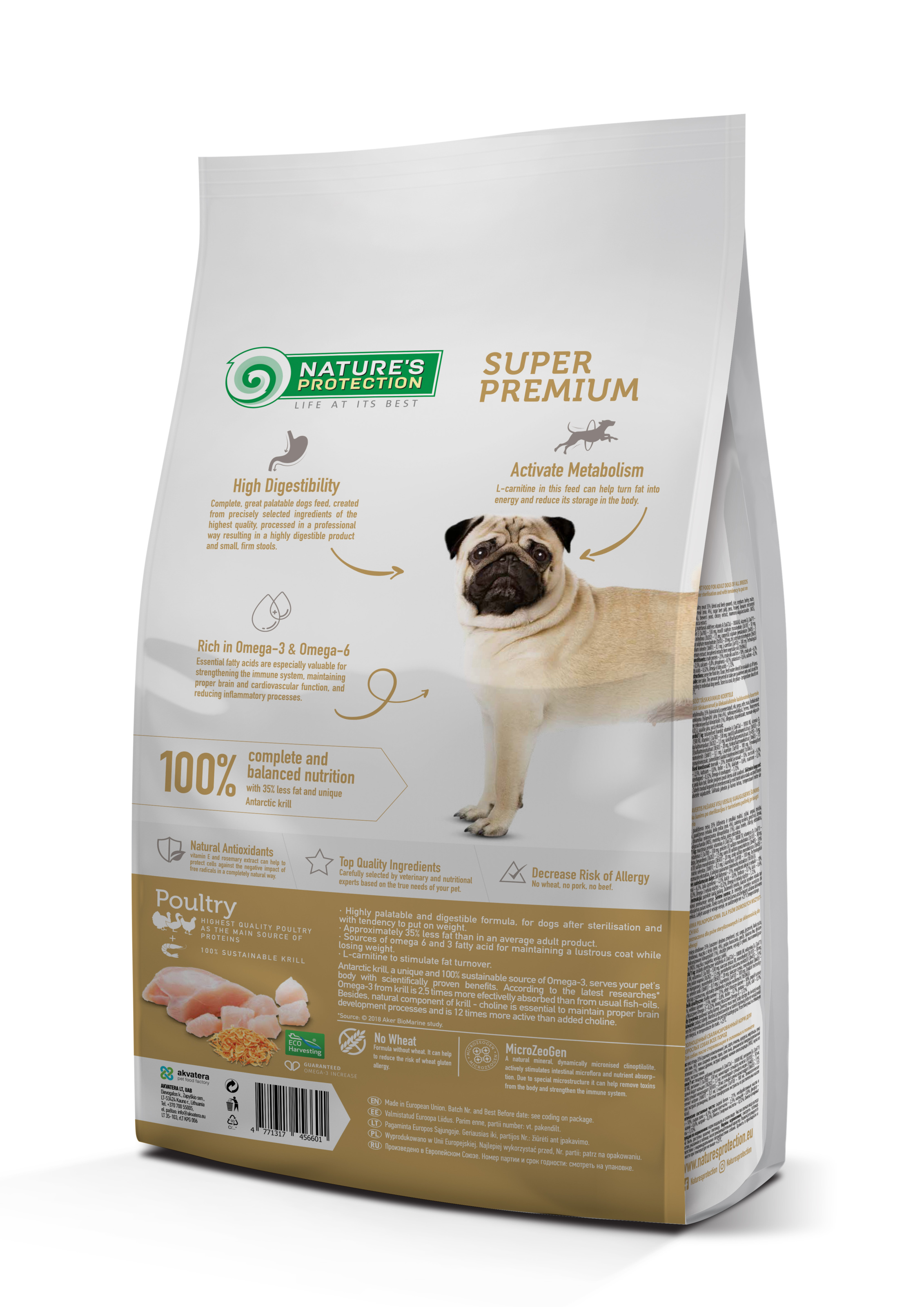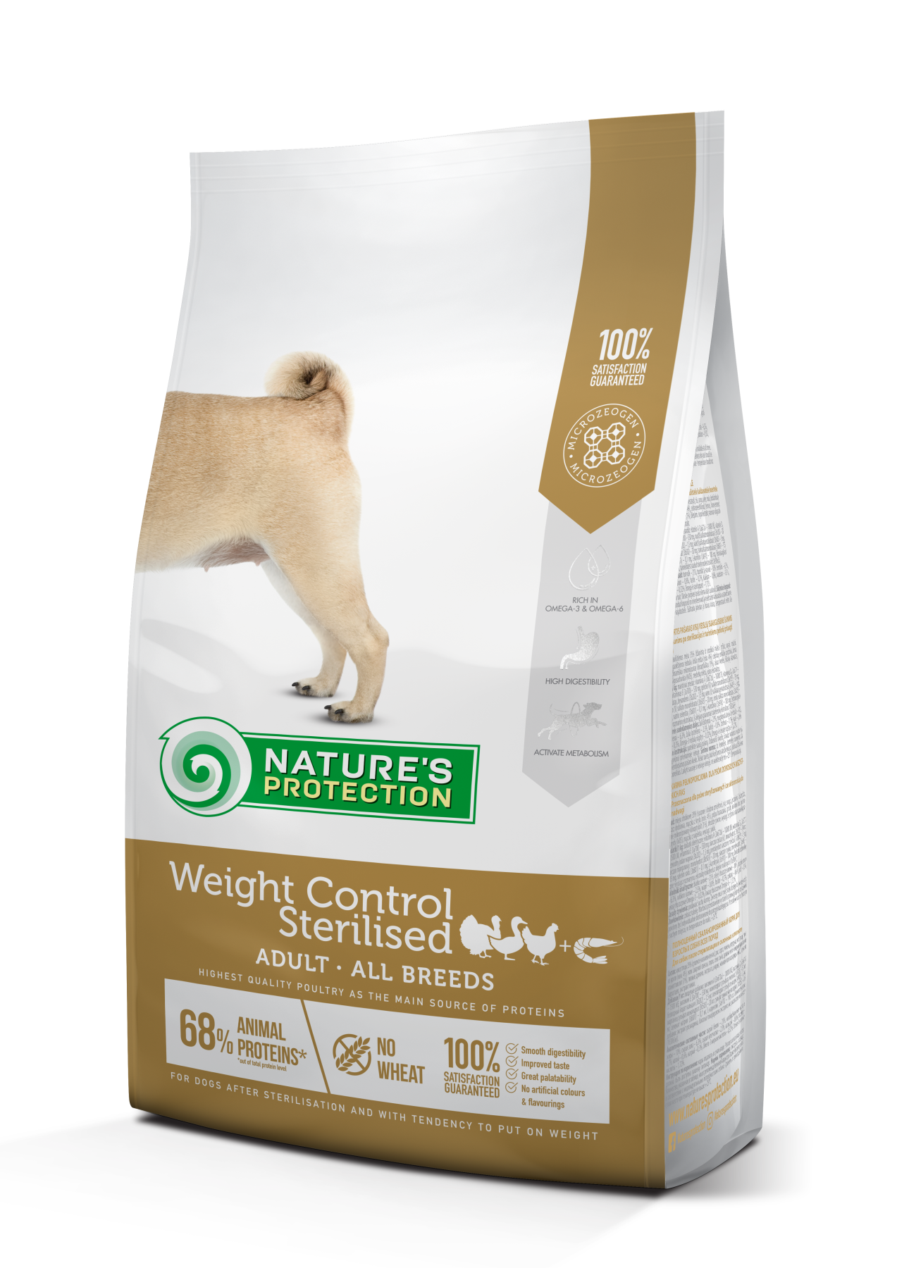 Сухий корм Nature's Protection для стерилізованих собак усіх порід із м’ясом птиці для контролю ваги відомий своїм добре збалансованим складом і сировиною, які допомагають покращити роботу травної системи, підтримувати здорову вагу та, як наслідок, невеликі тверді випорожнення.